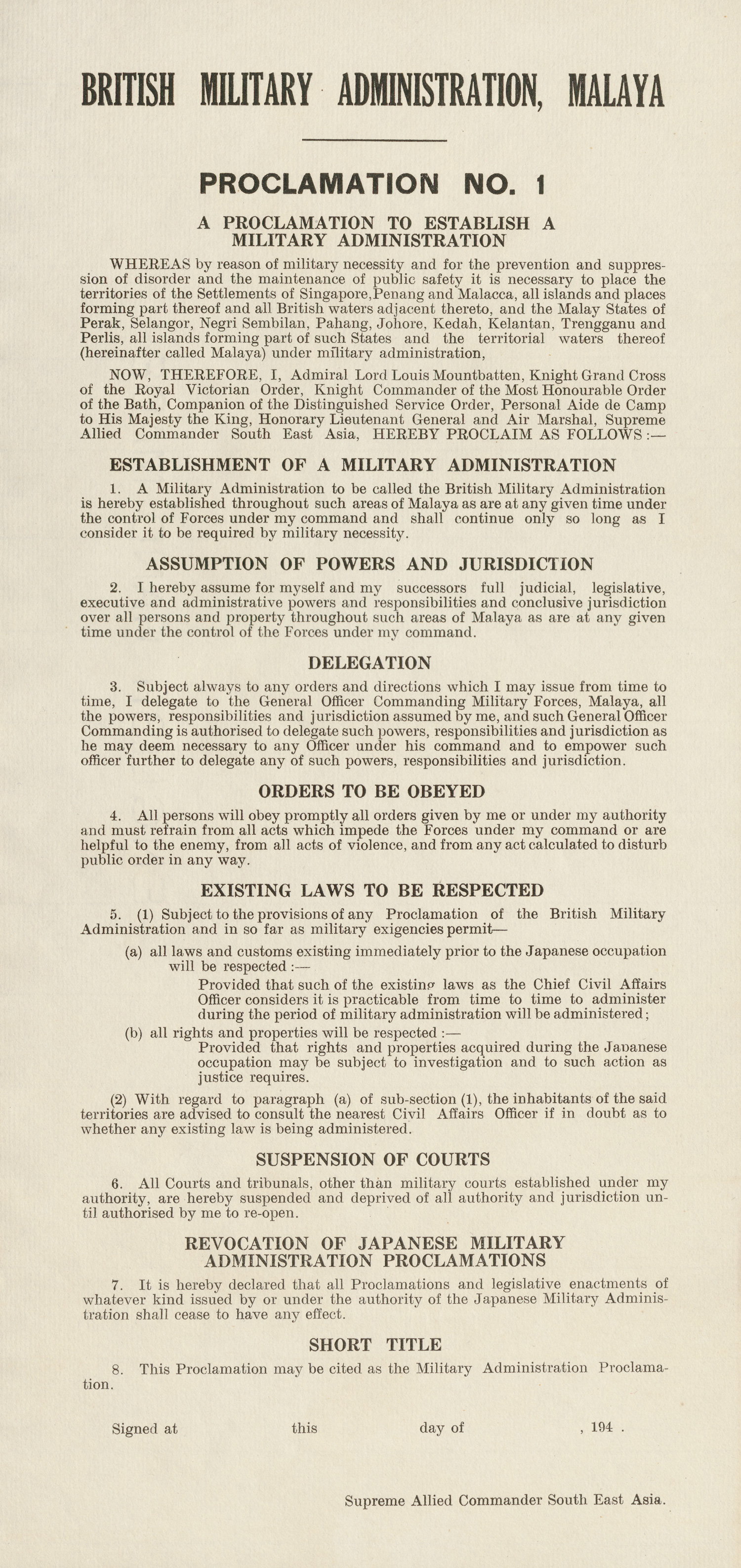 1945年9月12日,盟军代表蒙巴登将军接受日军投降时,在政府大厦的台阶上宣读成立英军政府的《一号宣言》(Proclamation No 1)。如今这份文件可说是“旧地重游”,这其中的历史厚重感,肯定会让前去看展的公众有不一样的感觉。