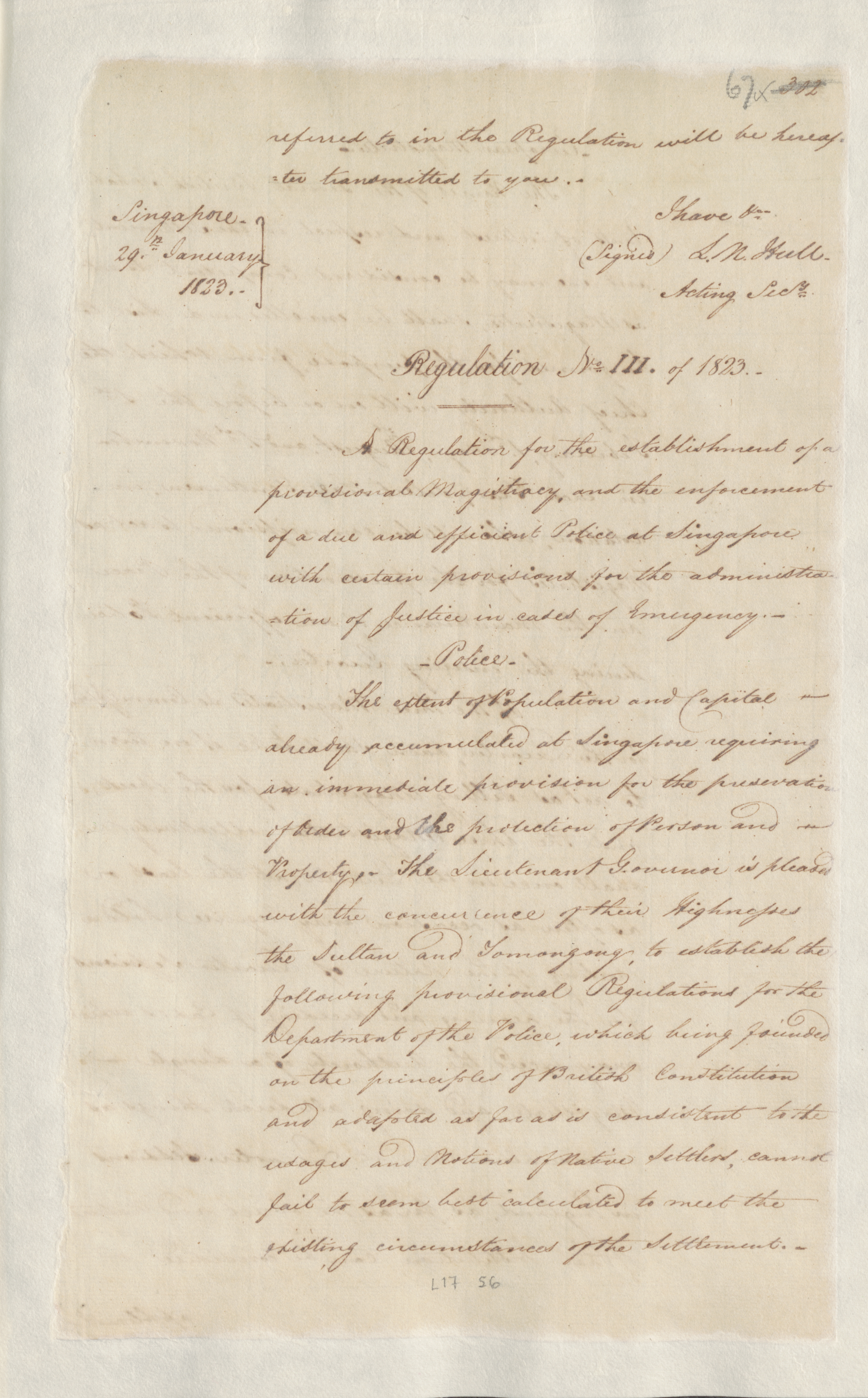 在这片土地上最早有法律意识的人相信就是最先登陆这座小渔村的英国人莱佛士。莱佛士1823年所制定的《莱佛士法规》共六条(Raffles’ Regulations),是英国人治理新加坡的最早行政法典。法规共有六条,包括: