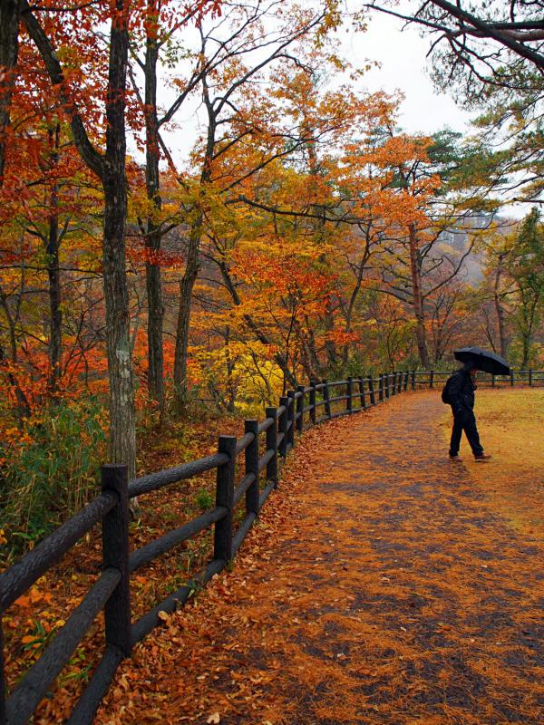 鸣子峡在宫城县西北部,是由流经鸣子温泉乡的江合川支流——大谷川长年累月地蚀刻而成的一座大峡谷,布满了急流冲刷出来的奇岩怪石和陡峭悬崖。有生以来第一次徜徉在红叶里,遥望被红叶、黄叶染得五彩缤纷的峡谷之间架着一座白色拱形的“大深泽桥”,宛如置身水彩画中。据说旅客喜欢在桥上耐心等候火车从山谷隧道出来,捕捉与峭壁、红叶组成的优美画面。这天,烟雨绵绵,游客不少,却少了“拍客”。