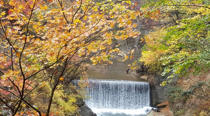 虽然要撑雨伞、穿雨衣、拿相机,但游兴丝毫不减。红叶让雨水清洗一番,显得更亮丽、清新。细雨霏霏的鸣子峡,山岚袅袅,好像披着白纱的新娘子。沿着石阶步道拾级而下,身旁是红叶、黄叶、绿叶;仰视、俯视都是色彩缤纷的秋叶,微风吹拂,片片飘落,有的不甘寂寞,还在空中盘旋起舞,才悄然落地,此情此景,谱写着秋诗篇篇……循着潺潺流水声远望,是一道宽阔、平直、跳动着的白水帘。溪水流淌着,跳跃着,给秋天带来了活泼的气息。