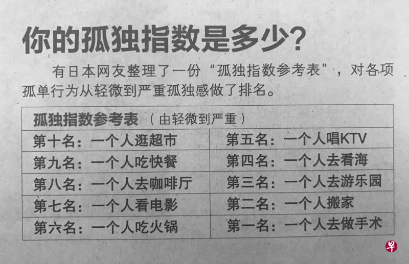 有日本网友整理了一份“孤独指数参考表”,对各项孤单行为从轻微到严重孤独感做了排名。