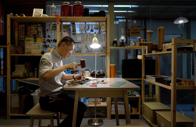 朱源亿靠看书、上网看视频自学皮革手艺。他在探索皮艺的道路上遇到的阻挠,促使他开店把所学传授给他人。他对皮革素材与工具要求严格,因此常穿梭各地寻找最佳材料。