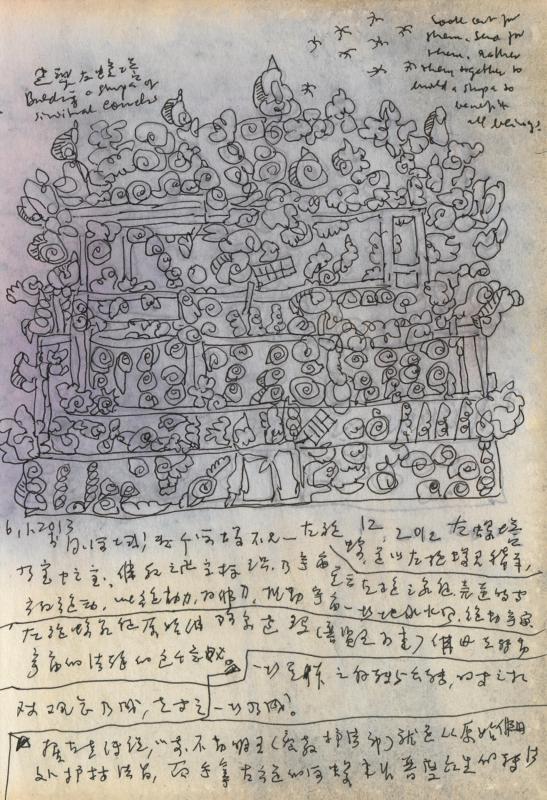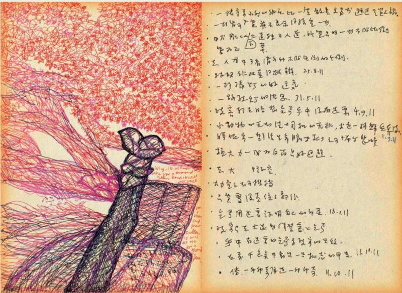 我国多元艺术家陈瑞献(73岁)首次公开他的“秘密花园”——稿本。之前他从没想过把稿本坦露公众眼前。稿本用中文行草硬笔或英文蝇头小字(中间穿插法文、马来文),密密麻麻捕捉火花灵见,写下思想概念,可以是一首诗、一幅书法、一方篆刻、一幅画,缀以速写插图,好似在照顾秘园。
