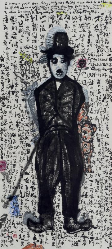 陈瑞献题字:“我始终是一个样,只有一个样。一个小丑。它把我摆在一个比任何政客更高的层次上。一天。没有笑。浪费一天。1889-1977年。查理·卓别林爵士,英国喜剧演员,电影制作人,反战人士。毕加索:小丑最有智慧。他发展出流浪汉一角色,外观小丑,内心君子。愚弄自己必需勇气。为后世建立喜剧之基础。默片时代。电影史上最伟大的人物之一。企鹅步伐。麦克·杰克逊模仿。失败并不重要。一根拐棍儿。一朵玫瑰。一只忠诚的狗。一双超大的鞋。涂鸦。草擦。喷绘在宣纸上。2013年。杂乱有章。生活在特写中看是悲剧,但在长镜中是喜剧。我喜欢。走在。雨/中/。因为没有人能看到我的眼/泪/。”