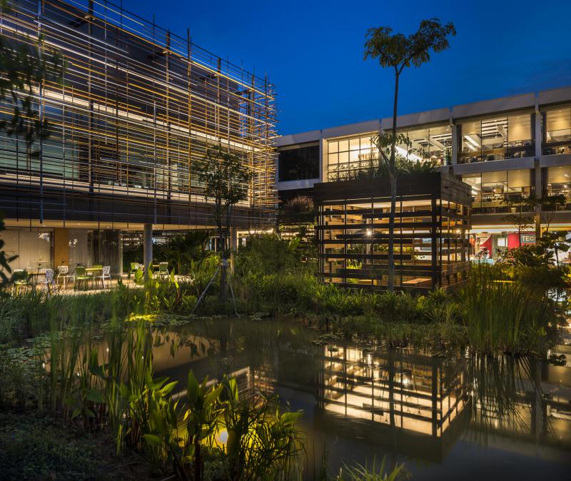 建筑师将华生工程的工业大楼,以两个体积呈现——一个是办公大楼,另一是专门生产精密工程器具的厂房,建筑师在两者间引入一条狭长的绿意花园,为硬邦邦的工业注入绿化生命。