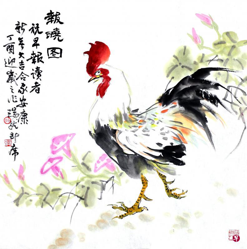 赖瑞龙:画写意彩墨鸡报晓图