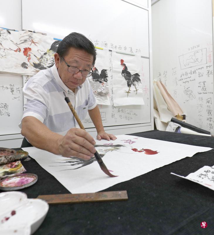 华人自古视鸡为吉祥动物,是辟邪、祈福、英武的象征。鸡年降临,联合早报记者专访本地画家赖瑞龙、李福茂和朱庆光,谈怎样用水墨、工笔和油彩画鸡。赖瑞龙也特为早报读者画了一张彩墨鸡画《报晓图》,祝福大家鸡年大吉!