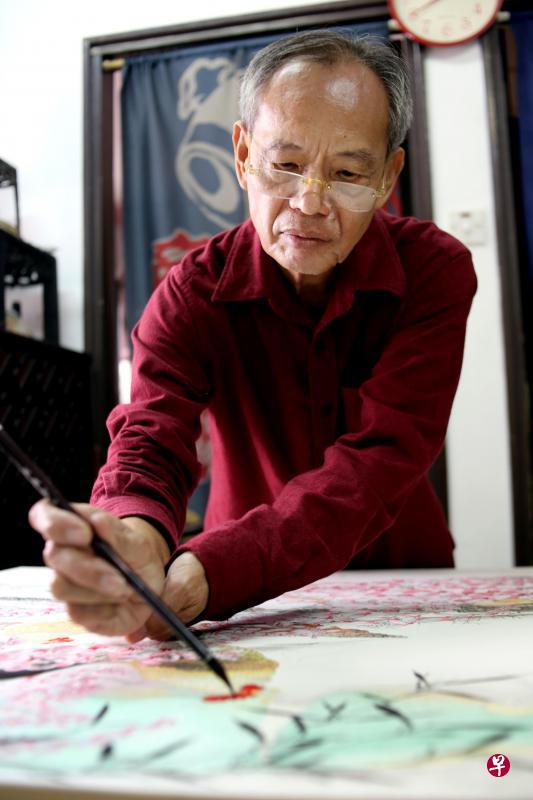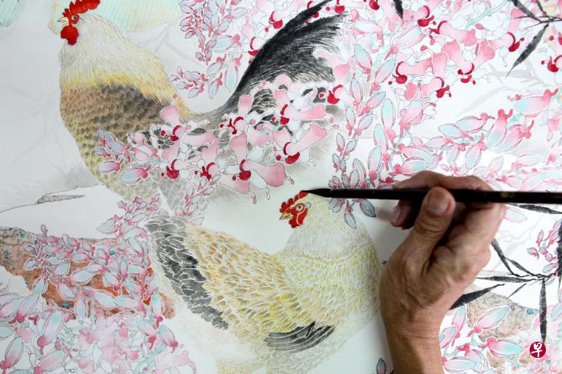 李福茂在2010年画过一张鸡画《天伦之乐》,胡姬花丛中,公鸡母鸡带几只小鸡,阖家融融,今年被新加坡华族文化中心拿去制作成红包封。去年底,他花了一个多月完成的另一张鸡画《和合如意》,已被画廊订走,未做框之前先给本报拍照。