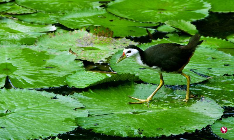 植物园里邵氏基金音乐台边的湖,就常有白腹秧鸡出没。这几只白腹秧鸡显然已经习惯了人来人往的环境。你可以坐在湖边,近距离观察它们那有趣的觅食情景。它们脚爪挺长,张开后脚掌的面积相对较大,那样它们就可以蜻蜓点水般地行走在水面的莲花叶上。