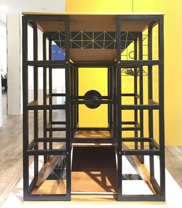 来自印尼峇厘岛,28岁室内设计师Daf Ashari从埃及猫女神巴丝特(Bastet)取得灵感,将两座切半的金字塔嵌入像迷宫的铁框里。金字塔内部和表面都有让猫儿磨爪的板面,两塔交会的中央还有个能让猫旋转、抓爬的球。他说:“猫儿排除障碍,爬上顶端就能像猫女神那样高高在上,俯视臣下。”