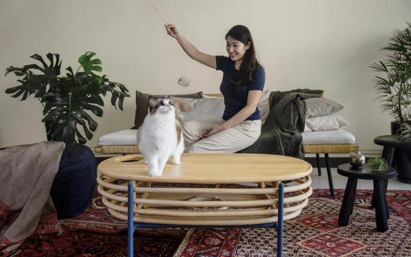 26岁女设计师与本地繁育纯种布偶猫的“布偶猫舍”合作,设计出“Hide and Seek”咖啡桌。桌面用实木打造,开小洞让猫探出头或钻入内层用藤条制成的镂空猫笼。梅玲说:“将桌底设计成一个藤笼是因为猫咪喜欢躲进半封闭的空间,选择藤条是因为它能轻易折成弧形,镂空的设计是让猫咪伸出猫手,与主人互动。”她还特地设计出一个绑在鱼线尾的鱼形纸玩具,主人在桌面上挥动引猫出笼。她说:“我刻意将这咖啡桌设计得不像猫家具是让摆在家里不会有违和感。假使某日家里不再养猫来,主人还能继续使用它。”