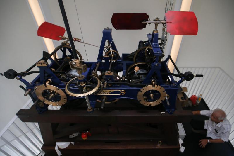 相比以前,现在的维修工作容易多了。不只上楼维修的次数减少,以前曾培杰每次维修上链须花上两小时,慢慢地搅上好几百公斤的秤砣。这是因为秤砣的重量往下垂拉着铁链,才可以让大钟机芯的齿轮继续转动;自动化以后,这一切都由科技代劳了。