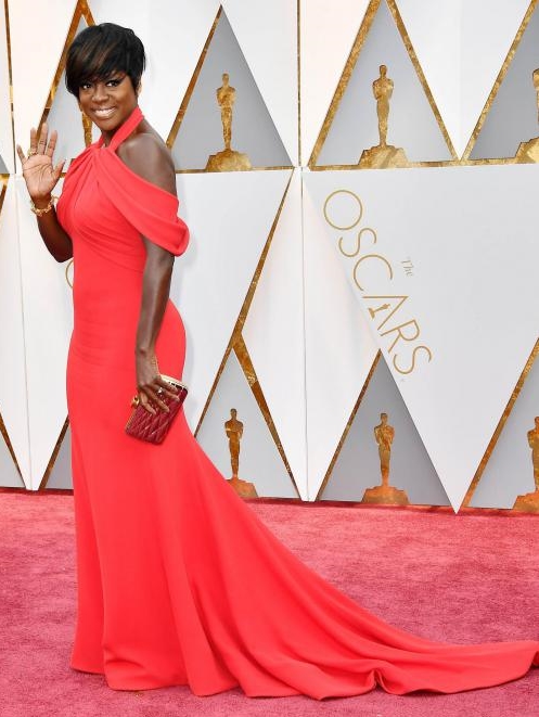 以《藩篱内的风暴》拿下最佳女配角的维奥拉·戴维斯(Viola Davis),在红毯上选穿Armani Prive丝绸礼服,高领露肩设计剪裁流畅,一身朱红让人眼前一亮,惊人气势让维奥拉成功吸睛,荣登红毯上的女主角宝座。