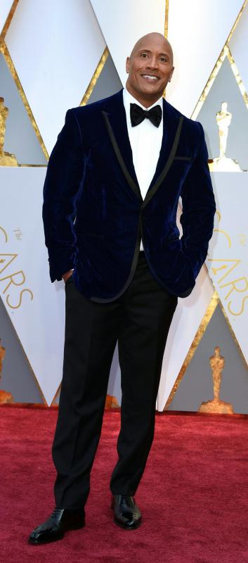 在奥斯卡颁奖礼上,众多男星的黑色燕尾服平平无奇,穿着深蓝色丝绒外套的强森,显得突出。摔跤手出身的他,拥有高大壮硕的身材,再加上亲切阳光的笑容,散发外刚内柔的魅力。他被美国《时人》(People)杂志封为去年的“全球性感王”,这样的魅力中年汉,谁会不迷倒在他宽厚的胸怀里?