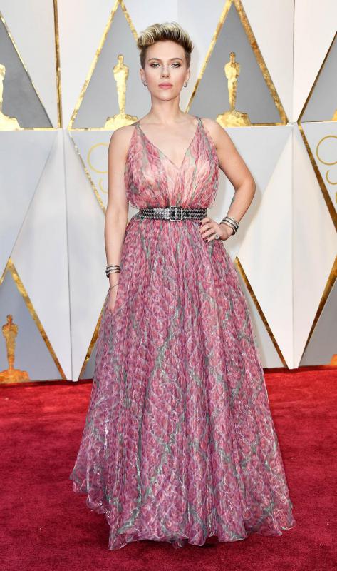 丝佳丽·约翰逊(Scarlett Johansson)庞克风的发型前卫,适合她百变女郎的形象,但却与柔美路线的粉红色礼服格格不入。这件礼服设计也不合身,衬不出她的好身材,图案也看不出所以然。腰间的黑色腰带有金属设计,或要显摇滚庞克feel,却是一大败笔,整体造型不伦不类,还能看到内衬半裙(petticoat),造型大打折扣。
