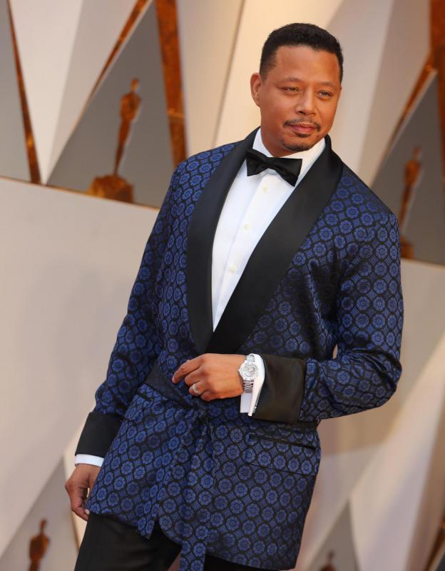 但在一众男星中,泰伦斯·霍华德(Terrence Howard)最跳脱也最让人看不懂,尽管他在色彩上不走寻常路,选了宝石蓝,而且也没和别人撞款,但怎么看都像走土豪风的睡衣,过于放松和舒适了,感觉是赶着上床就寝。原来,他的时尚缪斯是——杂志《花花公子》创刊人休·海夫纳(Hugh Hefner)。其他男星尚懂得看场合穿衣,霍华德则得好好问问自己的造型师是不是在耍他。