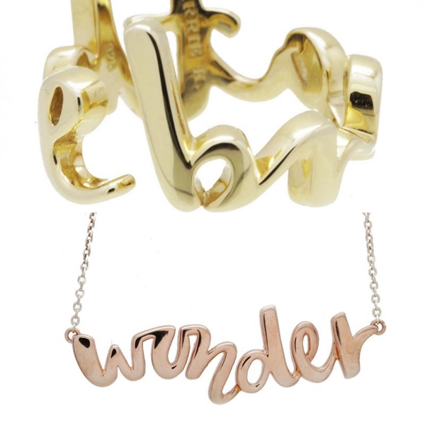 她后来在面簿上请网友和顾客选出两个最有正能量的字,得回“breathe”(呼吸)和“wonder”(惊叹)后,请两名书法家写成字,制成项链和戒指。她说:“在这个乌烟瘴气的国际政治氛围里,我一直在想怎样能激励人们记得正面思考,或帮助他们向别人传递正能量。我发现当人们肯把这些正能量的字句戴在身上,就是一种对自己的保证和许诺——每次望见就提醒自己正面思考。”