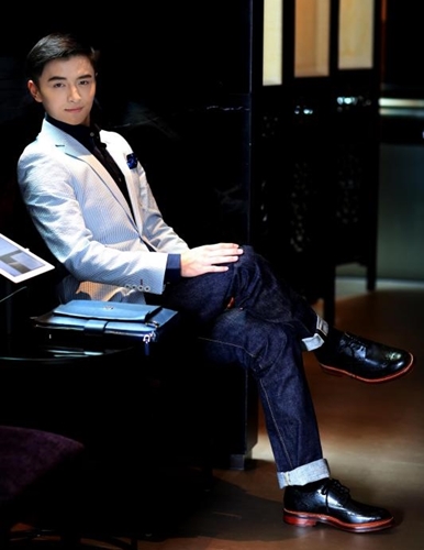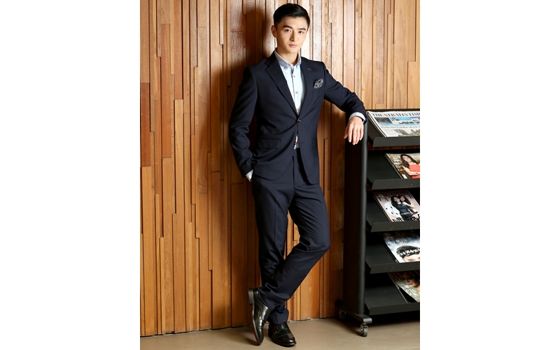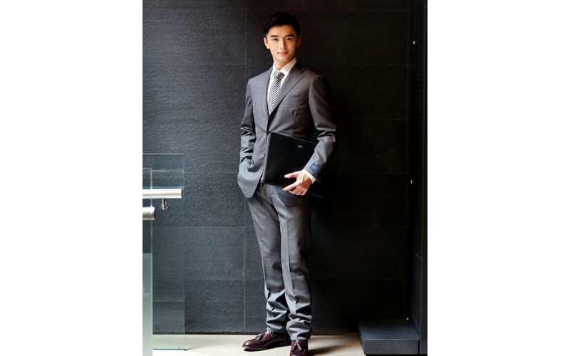灰色是本地男士最常选的西装颜色之一,在办公、开会或见客户时,它都是适宜的颜色,不会暗得沉重,也不会亮得轻佻。邬志健选择编织领带搭配西装,让整个造型变得不死板;鞋款也不拘泥于黑色圆头皮鞋,棕红色流苏皮鞋为整个造型添加时髦气息。