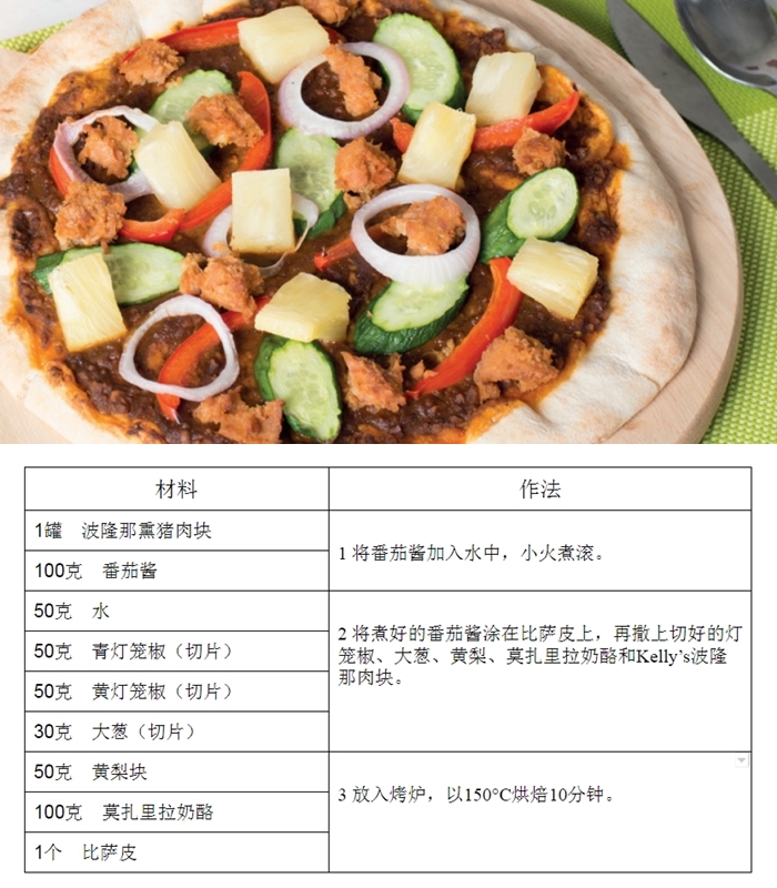 由于新加坡缺乏天然资源,生活中许多食物及日常用品都需要从国外进口,因此常让本地人认为罐头食品都非本地生产。但是,Kelly's熏肉类罐头系列却完全是在本地生产及包装的。 要将罐头食品制成美味的一餐并不难,关键在于烹煮方法。使用Kelly's熏肉类罐头系列,你只需三个简单的步骤,就能煮出美味健康的一餐! 自制披萨: (照片由Kelly's提供)