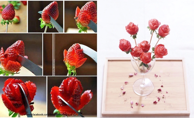 想让浪漫加分?你还可以将草莓雕刻成玫瑰花,再绑成花束送给情人。