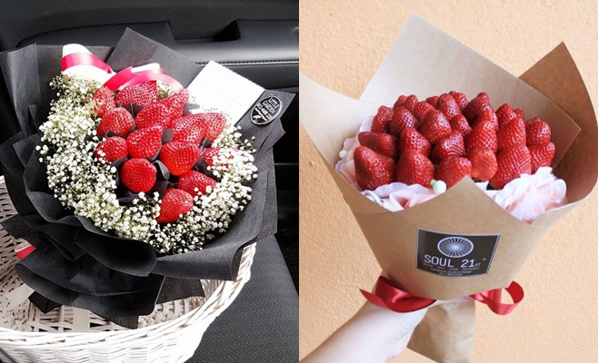 红玫瑰已经落伍了啦!现在流行比红玫瑰更红、更香的“草莓花束”!每次受到花束看着它慢慢枯萎都会觉得好舍不得,但是“草莓花束”就不同了!拍完一堆照片后,还能你喂我一颗、我喂你一口一起把草莓吃掉,除了可填饱肚子之外还能增进感情,简直一举两得!