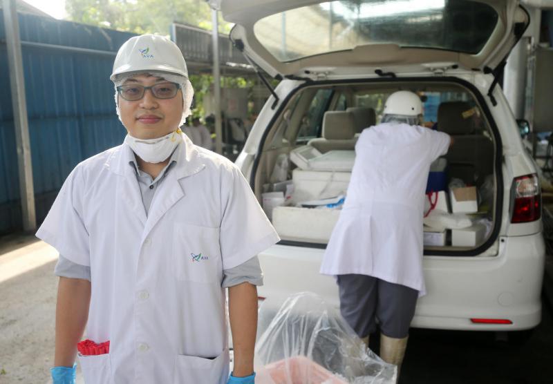 本地农场则由另一批检疫人员负责。农业管制署兽医唐子洋与同事管辖范围包括本地三家蛋鸡场、养鱼场、牛蛙场、牧羊场等。在蛋鸡场,除了收集蛋鸡口腔与肛门粘液样本、鸡蛋,他们也抽取饲料样本、水与鸡只粪便样本。