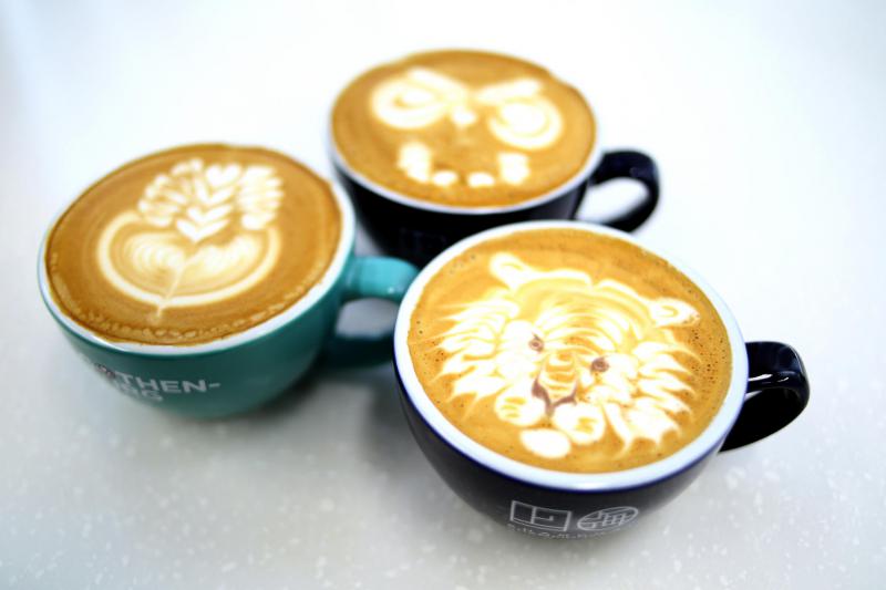 咖啡拉花竞赛要求参赛者呈现三个作品。他的作品是花束、猫头鹰和老虎。构思图案和练习费时至少一个多月。