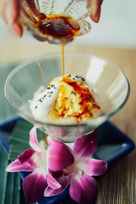 芒果糯米饭是经典的泰式甜品,本地泰国餐馆Sawadee Thai Cuisine还有榴梿糯米饭。