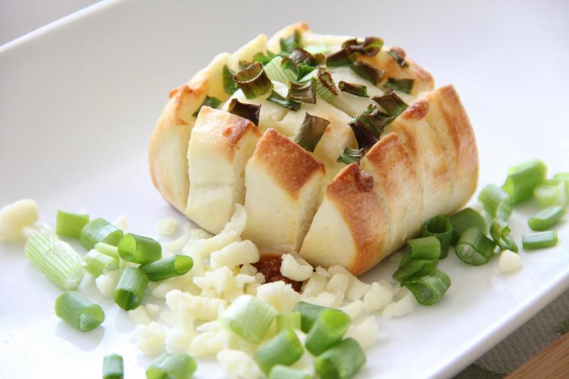 蒸白馒头放凉之后,在表面切出“井”字,塞入乳酪,撒上葱花,放入220摄氏度的烤箱,烤10分钟左右,乳酪融化烤焦后的香喷喷,加上葱花独特味道,中西合体的烤馒头,够你吃个饱。