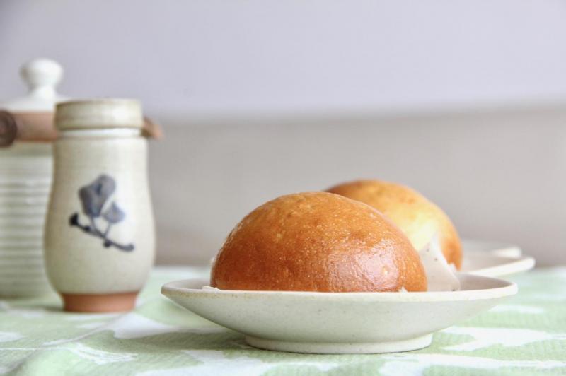 馒头出锅,稍微放凉之后,在表面刷上融化牛油,放入230摄氏度的烤箱,烤10至15分钟,等表面成金黄色,就可出炉。出炉馒头,稍凉一凉,趁热吃,皮脆内软,果然美味!