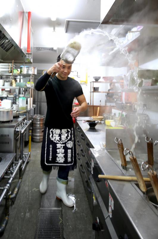 直井公介说,家系拉面在烹调过程的一大特色是,面熟透时将煮面的舀子高举快速挥下,将烫面水拨到地上,沥干面条。这是必要的动作,也有视觉效果。