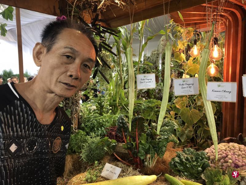 八年来在武吉班让社区花园“帮头帮尾”,城市农夫陈崇廉钻研出种植羊角豆的秘诀,今年栽培出46.4厘米长的羊角豆(图左一),夺得社区花园比赛的冠军。