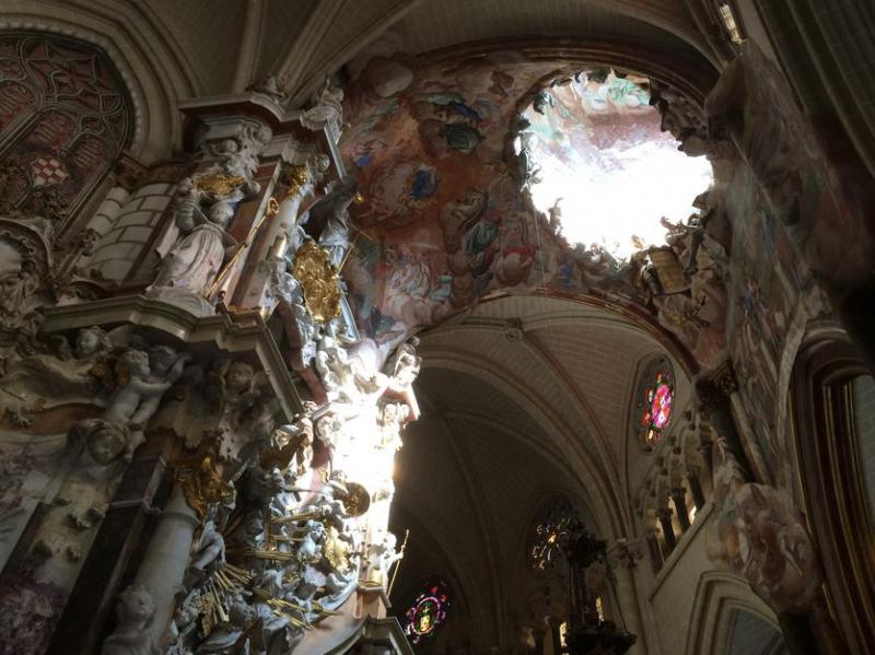 参观托雷多主座教堂,如同参观欧洲其他城市许多著名的教堂,得付费。入此堂的门票包括语音导览系统,讲解结合宗教音乐很有气氛。终于趋近那抹光,心情也跟着飞跃。独一无二叫El Transparente“透明祭坛”的设置,在主座教堂的半圆形回廊。为照亮此祭坛在高处开天窗,祭坛本身更有镂空处使光线能进一步射入,故名为“透明”。建筑师Nacisco Tome巧妙地将雕塑、绘画在窗洞内外与光结合,让人产生瞥见天国一角的错觉。