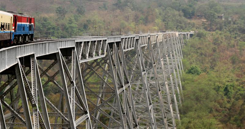从昔卜到彬乌伦这一段铁路号称是缅甸最迷人的火车路段,大家把窗口开得大大,把头探出去。可是火车离开车站还不到20分钟,就看到前面车厢的乘客急急忙忙地将窗口关上,还来不及回过神,就看到前座的韩国游客被泼得一身水。