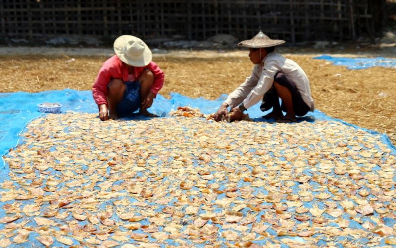 这里没有庆祝新年的习惯,更别说是泼水节。长长的白沙滩因为旅游淡季,几乎看不到游客。沙滩旁边是小渔村,渔民们不是在修补渔船,就是将捕捉到的鱼或乌贼摊在太阳底下晒干。