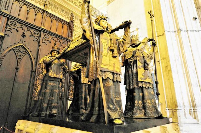 导游说,他们抬的是伟大航海家哥伦布的灵柩,石棺里躺着哥伦布的遗骸,抬棺的是16世纪初西班牙四个王国的国王造型。