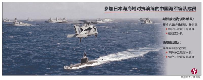 新华社所说的“他国”显然包括日本。日本防卫省8月17日发布公告说,16日傍晚,日本海上自卫队监测到隶属于中国东海舰队的3艘舰艇在对马海峡西北海域向东北偏北方向航行。此前,日本海上自卫队第二航空群P-3C巡逻机于8月14日下午在宫古海峡发现向西航行的中国海军舰队。
