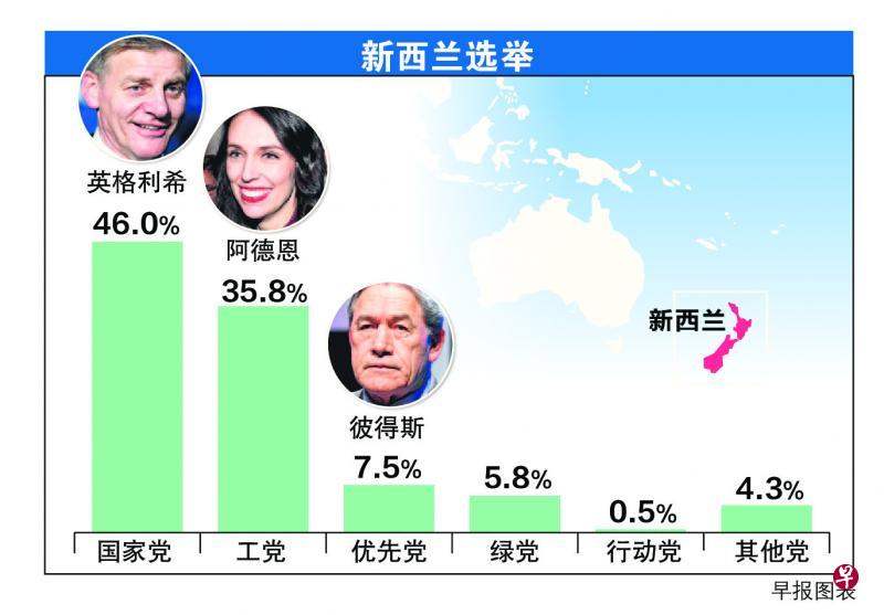 新西兰选举委员会计算了所有选票后,总理英格利希(Bill English)领导的国家党和年轻女对手阿德恩(Jacinda Ardern)领导的工党得票率分别为46.0%和35.8%,优先党得7.5%、绿党5.8%,其他小党得票很少。