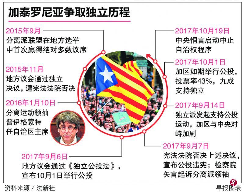 (马德里综合电)西班牙加泰罗尼亚自治区在限期过后仍不声明放弃争取独立,中央政府准备援引宪法终止加区自治权。西班牙内阁将于明天(21日)就此举行特别会议,公布应对方案。预料西班牙议会将于24日批准中央政府的决定。