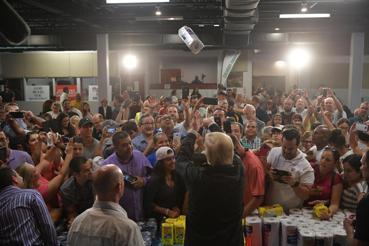 波多黎各多个地区2017年10月受到飓风“玛利亚”重创。特朗普10月3日在当地视察灾情及探访灾民,在一个临时救援物资中心向灾民分发用品时向人群扔纸巾。
