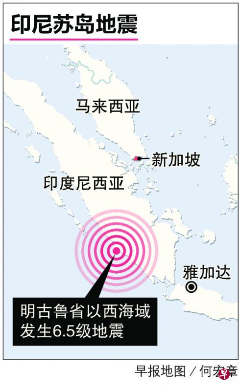 (雅加达/新加坡/新山综合讯)印度尼西亚苏门答腊岛南部昨日上午发生6.5级地震,远在新加坡及马来西亚也能感受到震动,幸未有任何伤亡报告,当局也未发出海啸警告。