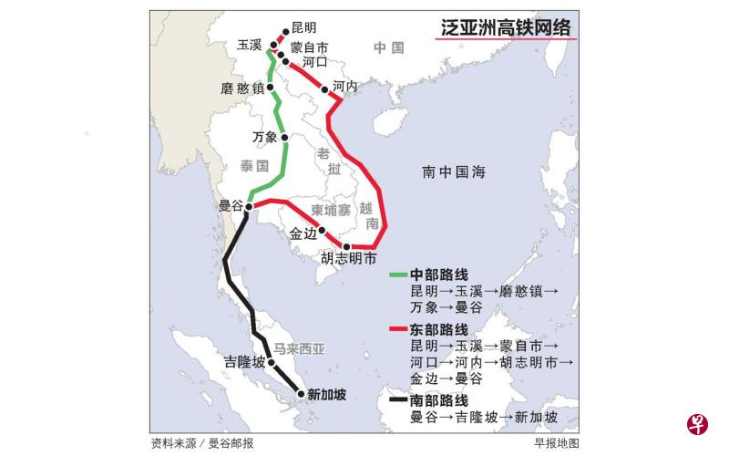 《曼谷邮报》报道,这项庞大工程主要分为泰国到老挝及中国南部、泰国到柬埔寨、泰国到马来西亚和新加坡,以及曼谷到清迈四条路线,全长达3193公里,造价约2.07万亿泰铢(约914亿新元)。