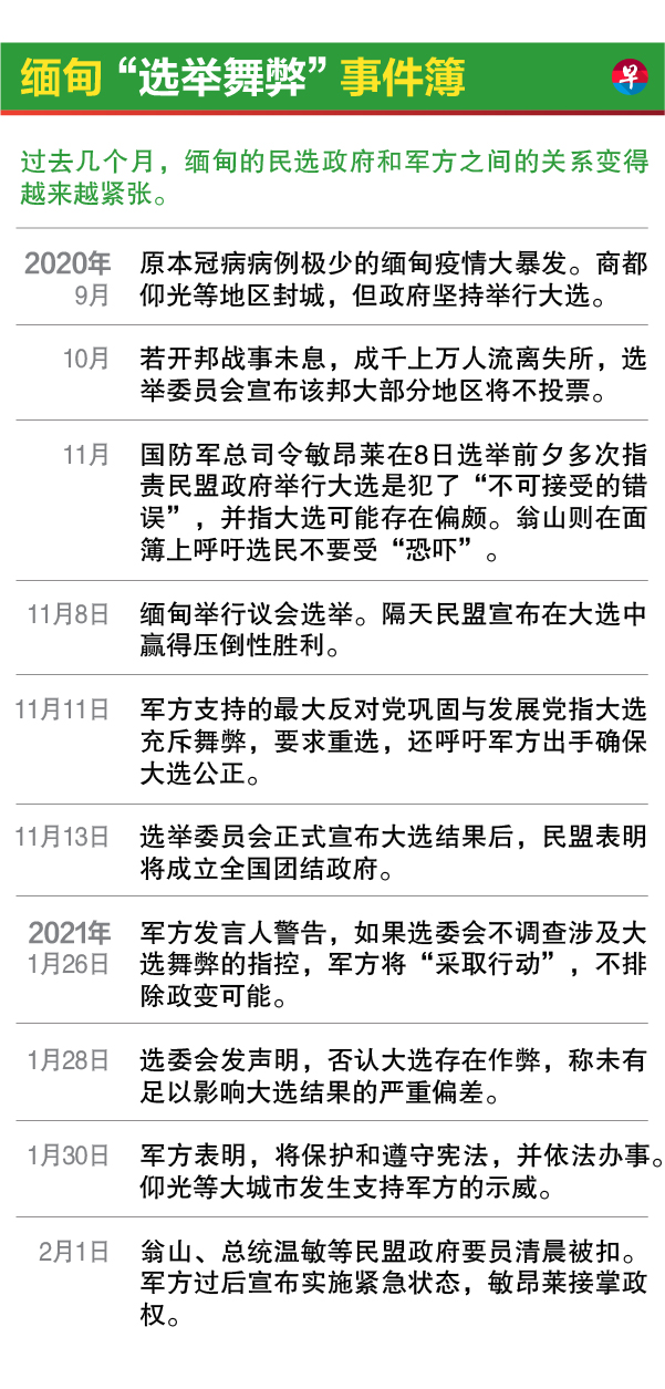 缅甸军方2月1日上午发动政变,逮捕了缅甸国务资政翁山淑枝、总统温敏和部份高级官员,引起国际社会高度关注。zaobao.sg带你了解这起政变事故的来龙去脉。