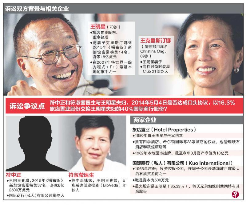 根据诉状,他们指王明星夫妇两年前在旅店置业旗下的希尔顿酒店,同意以他们夫妻持有的40%国际商行(私人)有限公司(Kuo International)股份,交换他们兄妹俩的16.3%旅店置业股份。