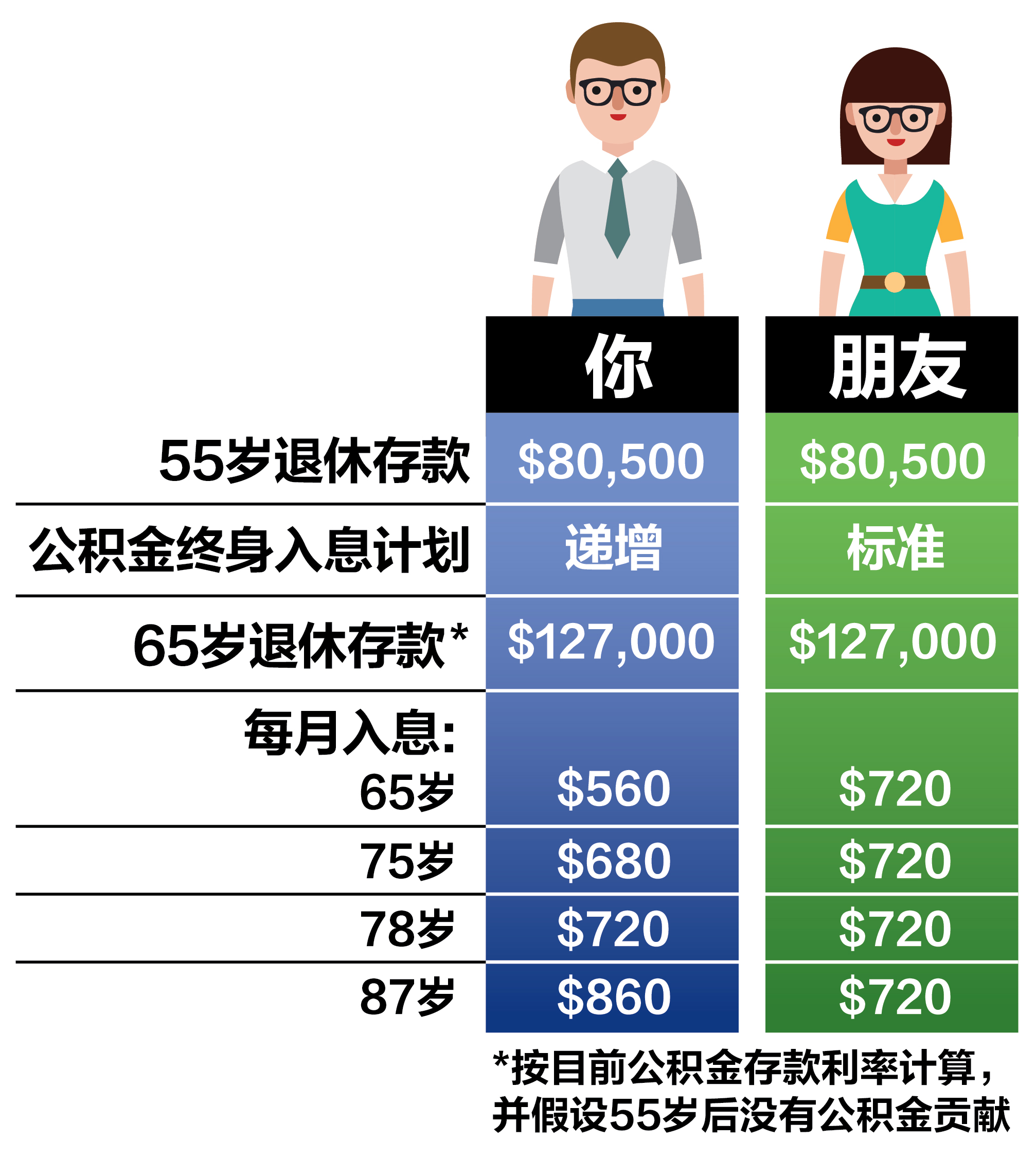 如果你选择递增计划,并且要在65岁时与朋友一样领取每月720元入息,那你55岁就需要填补约2万7000元(比基本存款多33%),或者在65岁时填补3万9000元。