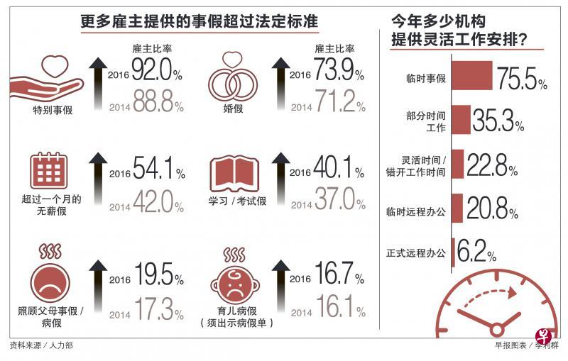 越来越多机构愿意配合雇员需求,临时为他们做灵活工作安排,也有更多雇主提供高于法定标准的事假,这些亲家庭措施降低了员工离职率。