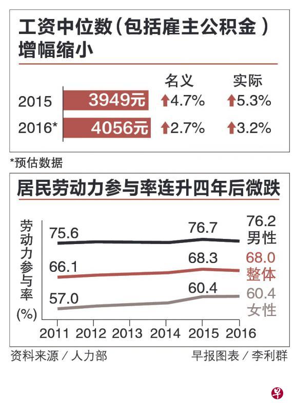 据人力部昨天发表的《2016年新加坡劳动力报告》预估数据显示,截至今年6月,本地全职居民的名义工资中位数达4056元,比前一年的3949元高2.7%。如考虑通货膨胀率下跌,今年实际工资中位数的增幅预计达到3.2%。