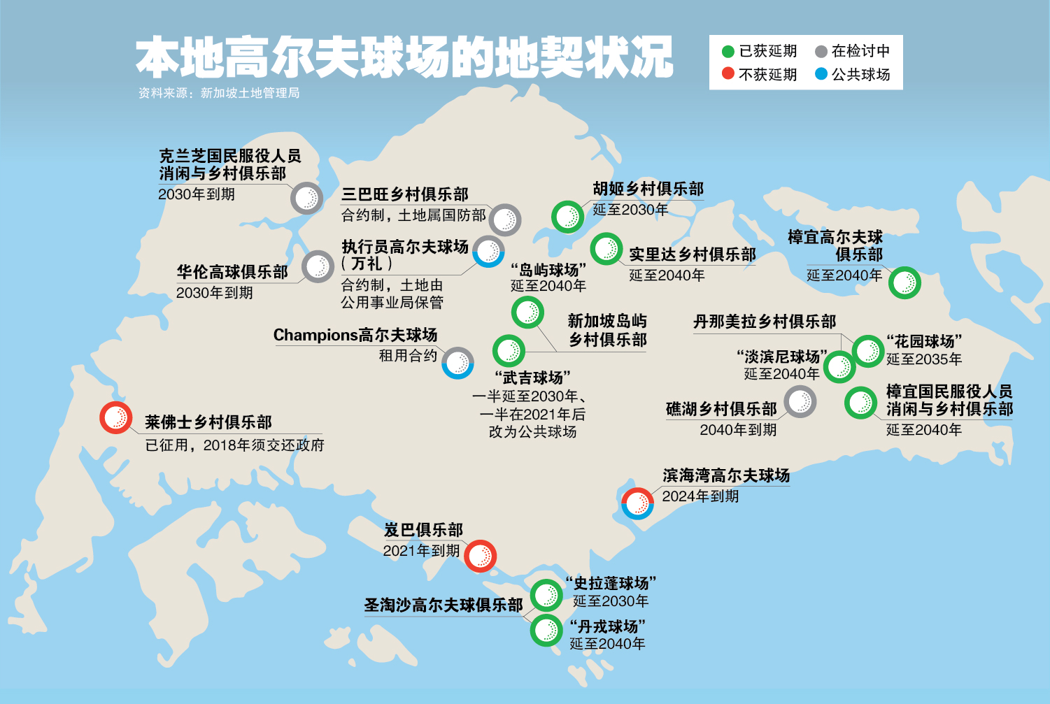 新加坡目前有16个高尔夫球场(13个私人高球俱乐部,3个公共球场),共占地1450公顷,是新加坡土地面积的2%。去年裕廊乡村俱乐部因为要“让路”给新加坡—吉隆坡高铁新加坡终站,2016年年底结束营业。今年伊始,莱佛士乡村俱乐部也步其后尘,令许多俱乐部会员失望,俱乐部员工也可能面临失业。
