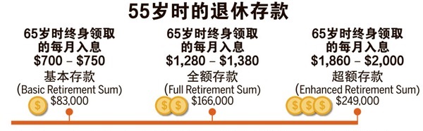 您退休后领取的每月入息将视您的退休存款而定。假如您在55岁后继续工作,您可将新的公积金存款转到退休户头。此外,您也可用现金填补退休户头,或者让您的子女用现金或他们的公积金存款为您填补。