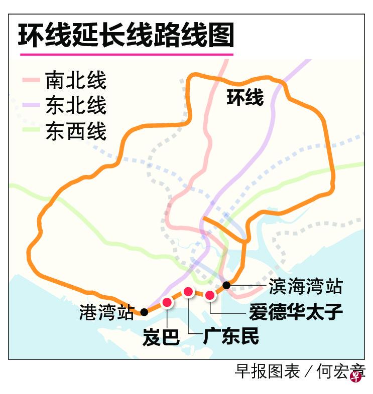 这条延长线约长四公里,将耗资约37亿元建造,预计2025年建成,三个新地铁站是岌巴、广东民和爱德华太子站。环线为此将添购多11列新列车。